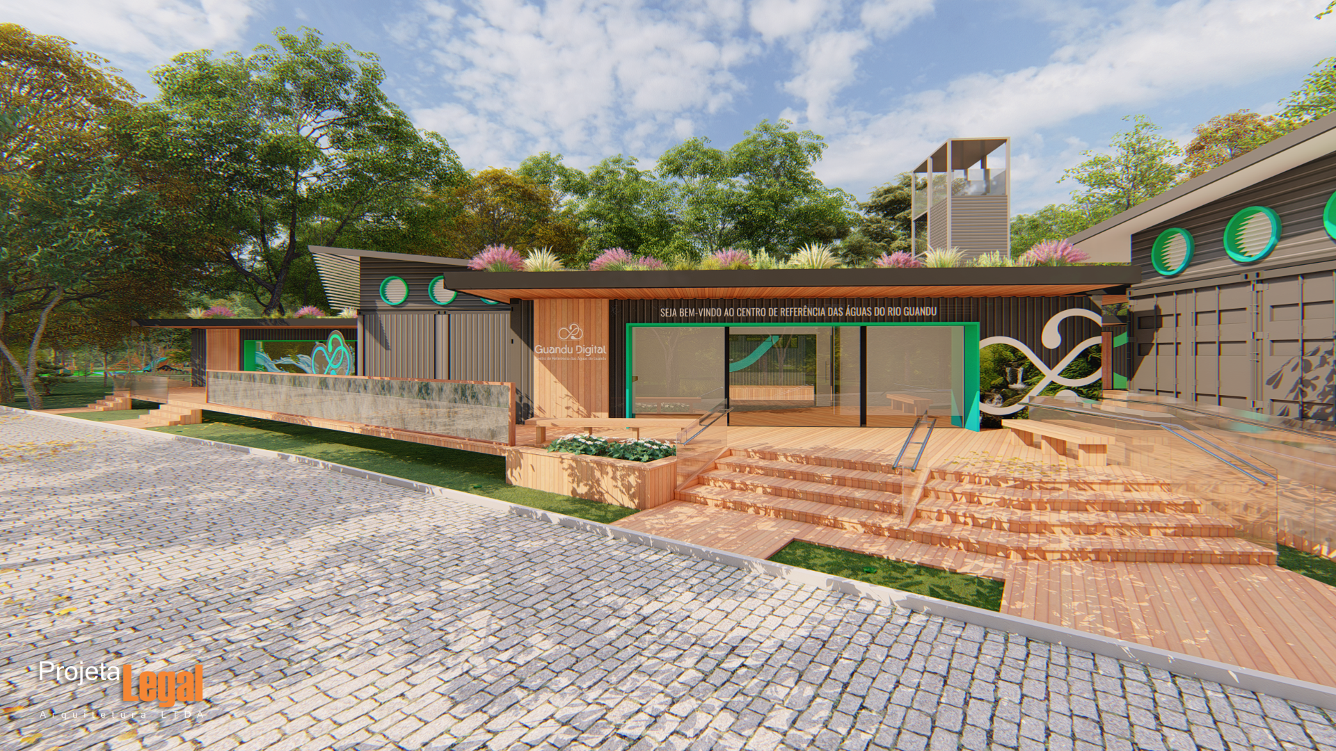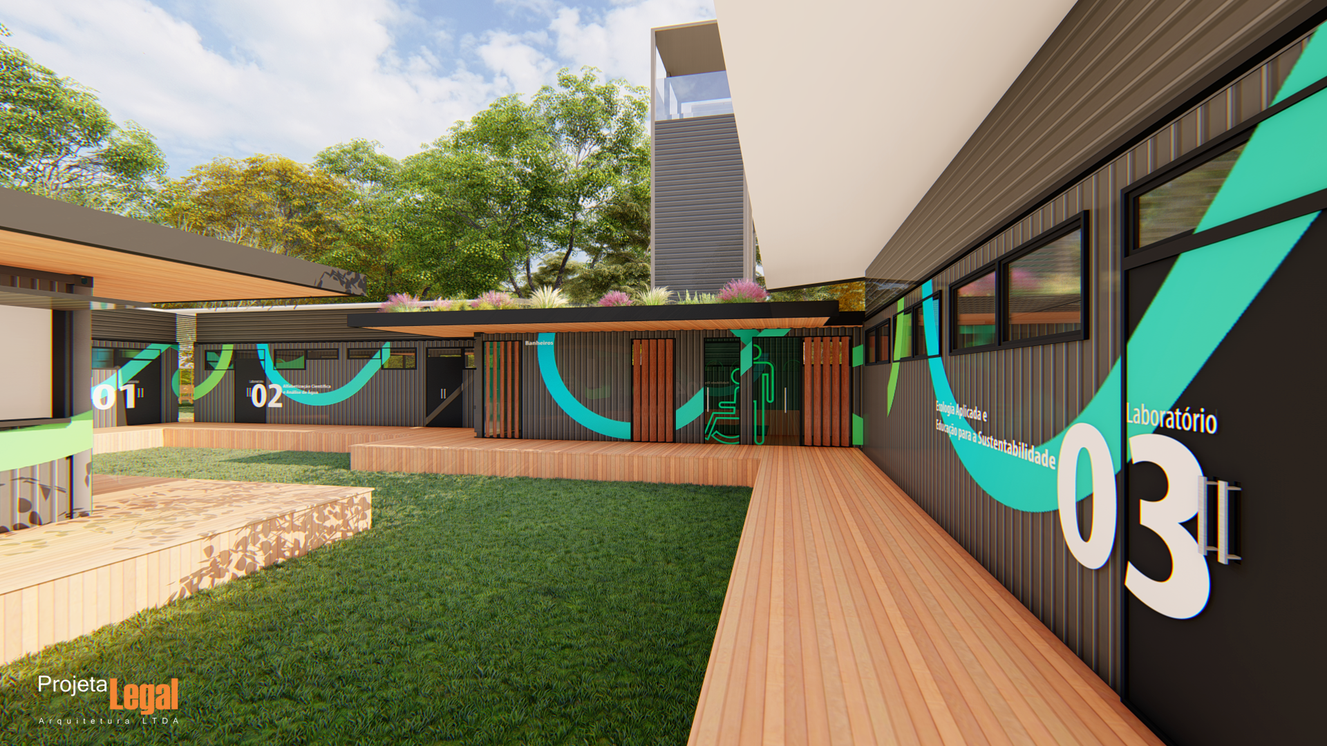 Estudo Preliminar de implantação em área preservada utilizando containers e caminhos elevados em madeira para a sede de uma ONG localizada no Rio de Janeiro.